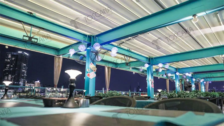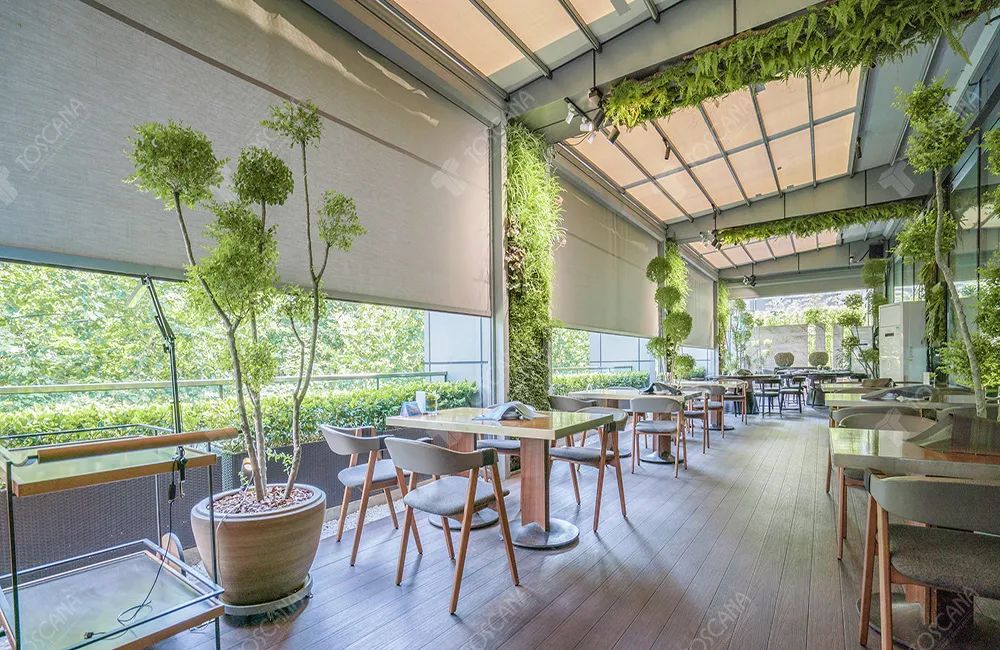 露天餐厅设计:如何借助“TOSCANA新式电动轨道天篷”让露天餐厅显得更有高级感?