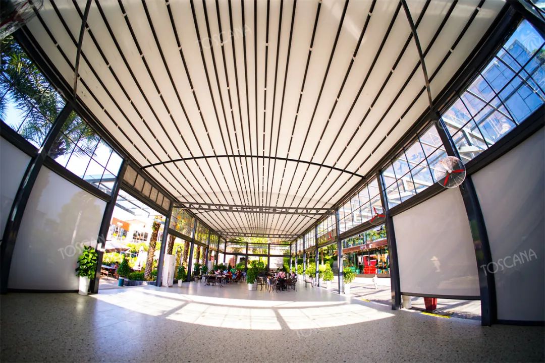 在TOSCANA所打造的全新商业中庭空间下,可随着阳光灵活调节篷顶开合状态或光线角度,任意切换空间场景,保持空间处于舒适的温度状态,带来不错的节能增益。