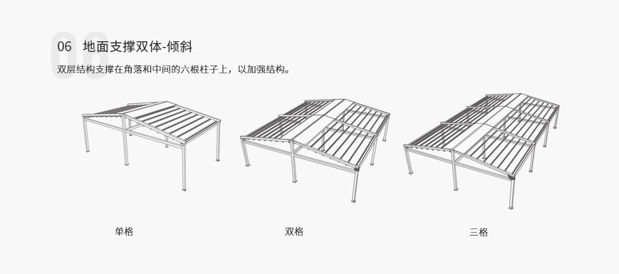 单套产品宽度可长达13.5m,单边外飘伸展达11m(双边22m,中间无立柱),能承受50~70km/h的风力,是目前国内首家也是唯一具备大型室外电动遮阳产品。